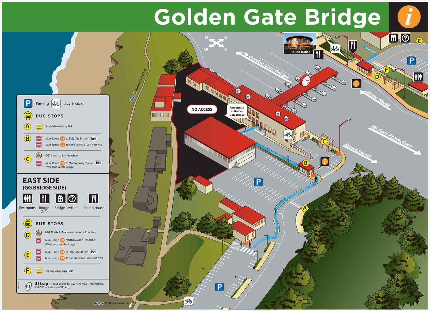 - Traveling north from San Francisco: Follow U.S. Highway 101 north across the Golden Gate Bridge. Take the first exit called "Vista Point" and turn right into the parking lot.