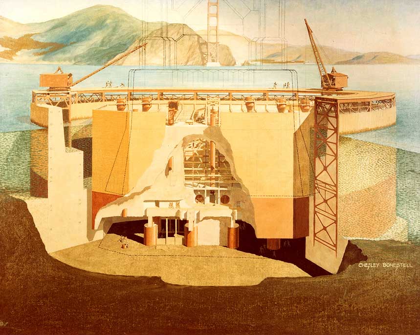 The Golden Gate Bridge has one of the most robust ship collision protection systems of any bridge on the West Coast. The Golden Gate Bridge main span is 4,200 feet long and is supported by two towers on each end. The North Tower sits half on land and half in the water, and a large vessel would run aground before colliding with the pier. The South Tower, which is anchored to bedrock beneath the water, is protected by a concrete fender ring that extends into the seabed. The concrete fender is filled with sand, similar to a highway crash barrel, and is 27 feet thick at its base and 10 feet thick at sea level, providing significant protection against collisions. Here is an artist’s watercolor illustration from the 1930s of the South Tower pier and fender protection.