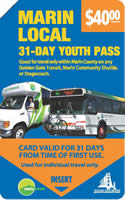 Marin Transit offers an annual youth pass through participating schools and a College of Marin pass. These passes are NOT valid on any Golden Gate Transit or Golden Gate Ferry route. For more information, visit the Marin Transit website.