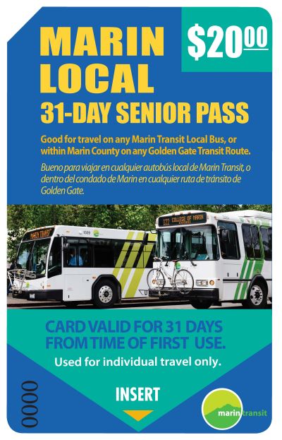 Day and monthly passes are available for unlimited rides within Marin County for adults, youth, and seniors/persons with disabilities. Day passes are only issued from the farebox on board all Golden Gate Transit and Marin Transit buses that operate within Marin County. Monthly (31-day) passes can be purchased online, over the phone (call 511 and say "Golden Gate Transit," then "operator"), or in person at the Customer Service Center at the San Rafael Transit Center (850 Tamalpais Ave, Platform D). For more information, visit the Marin Transit website.